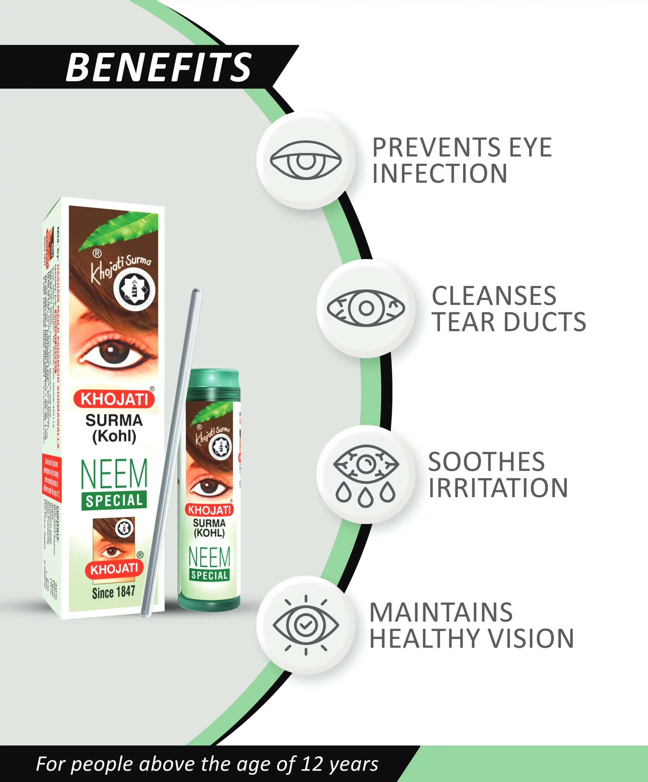 Khojati Surma Neem Special is a herbal Surma that cleans the eyes of any impurities. It delivers an antibacterial effect that washes out bacteria preventing eye infections and cleanses the tear ducts and waterline. It produces a cooling effect and maintains healthy eyes.