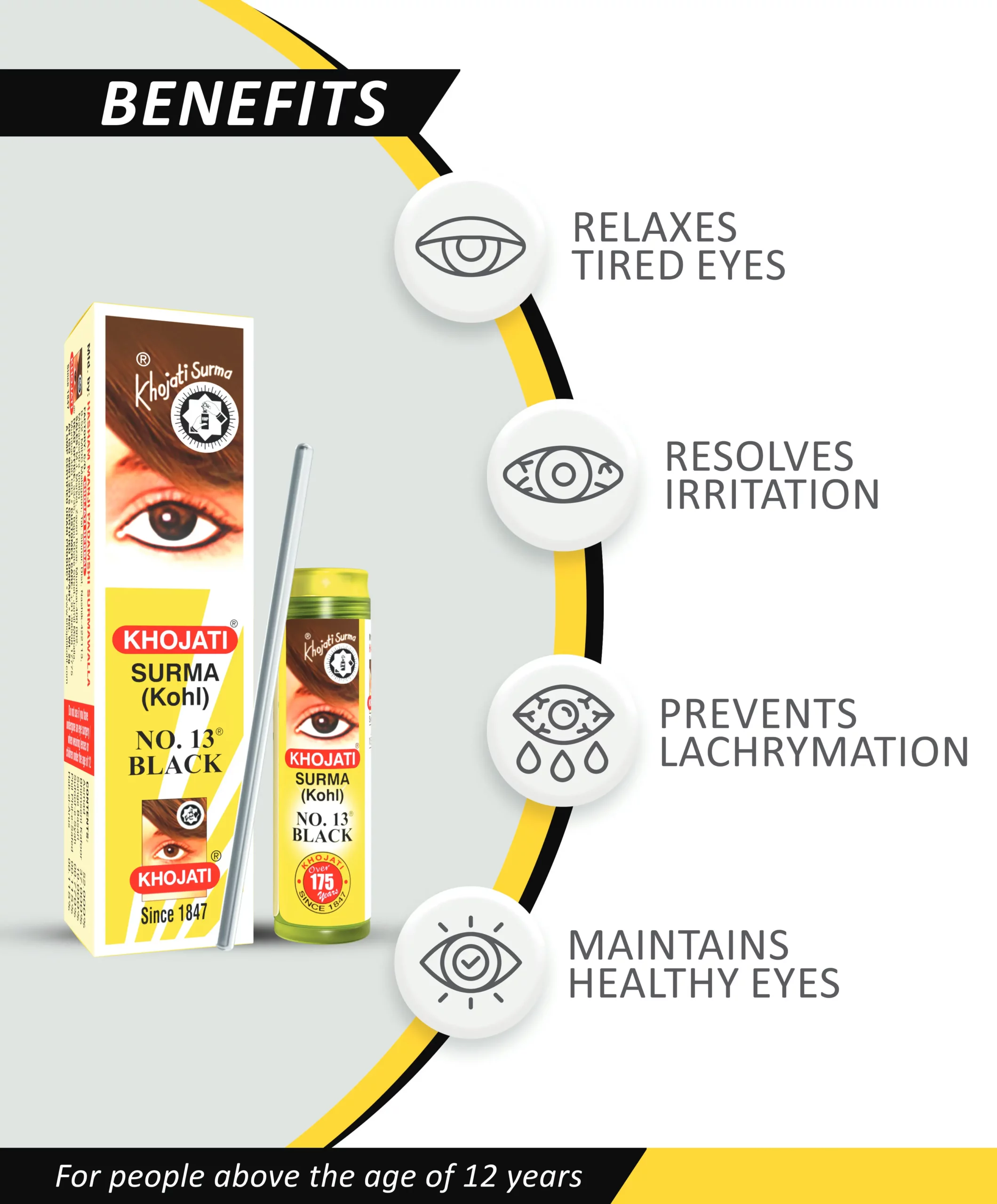 Khojati Surma No.13 is a pure, herbal surma/kohl that produces a pleasant cooling sensation which relaxes tired eyes, soothes irritation, resolves dryness and redness, and prevents lachrymation (watery eyes). Regular use of this surma maintains healthy eyes.