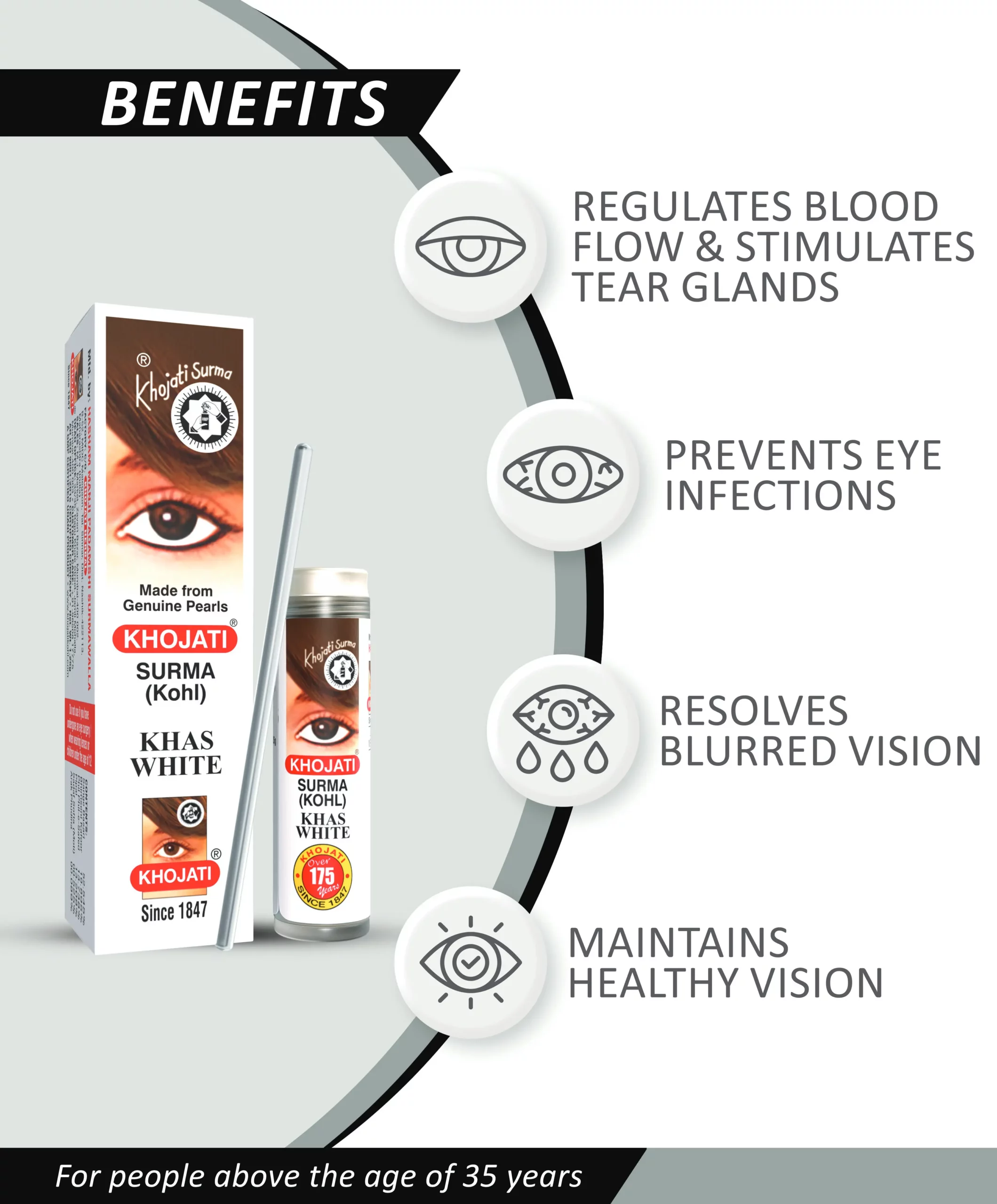 Khojati Surma Khas White is enriched with herbs that stimulate tear glands thereby purifying eyes and preventing eye infection. The strong sensation of this Surma regulates eye blood flow which helps maintain healthy vision.