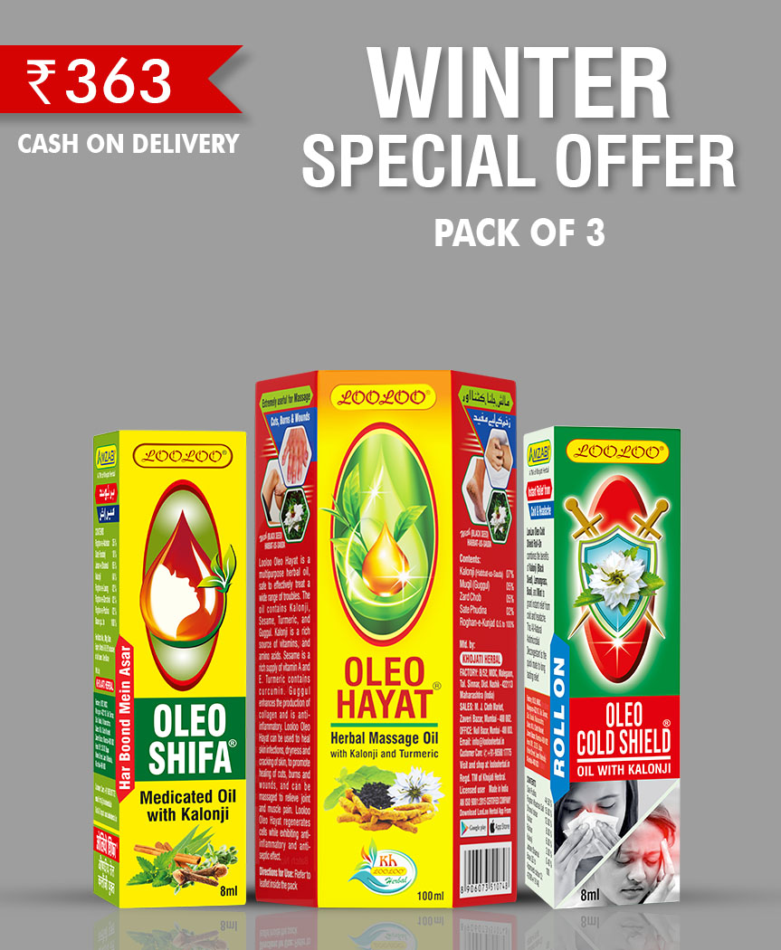 - Pain Relief Massage Oil – Massage the oil on inflamed joints and muscles to relieve pain. To enhance the efficacy, mix this oil with LooLoo Oleo Rheuma Herbal Liniment with Kalonji.